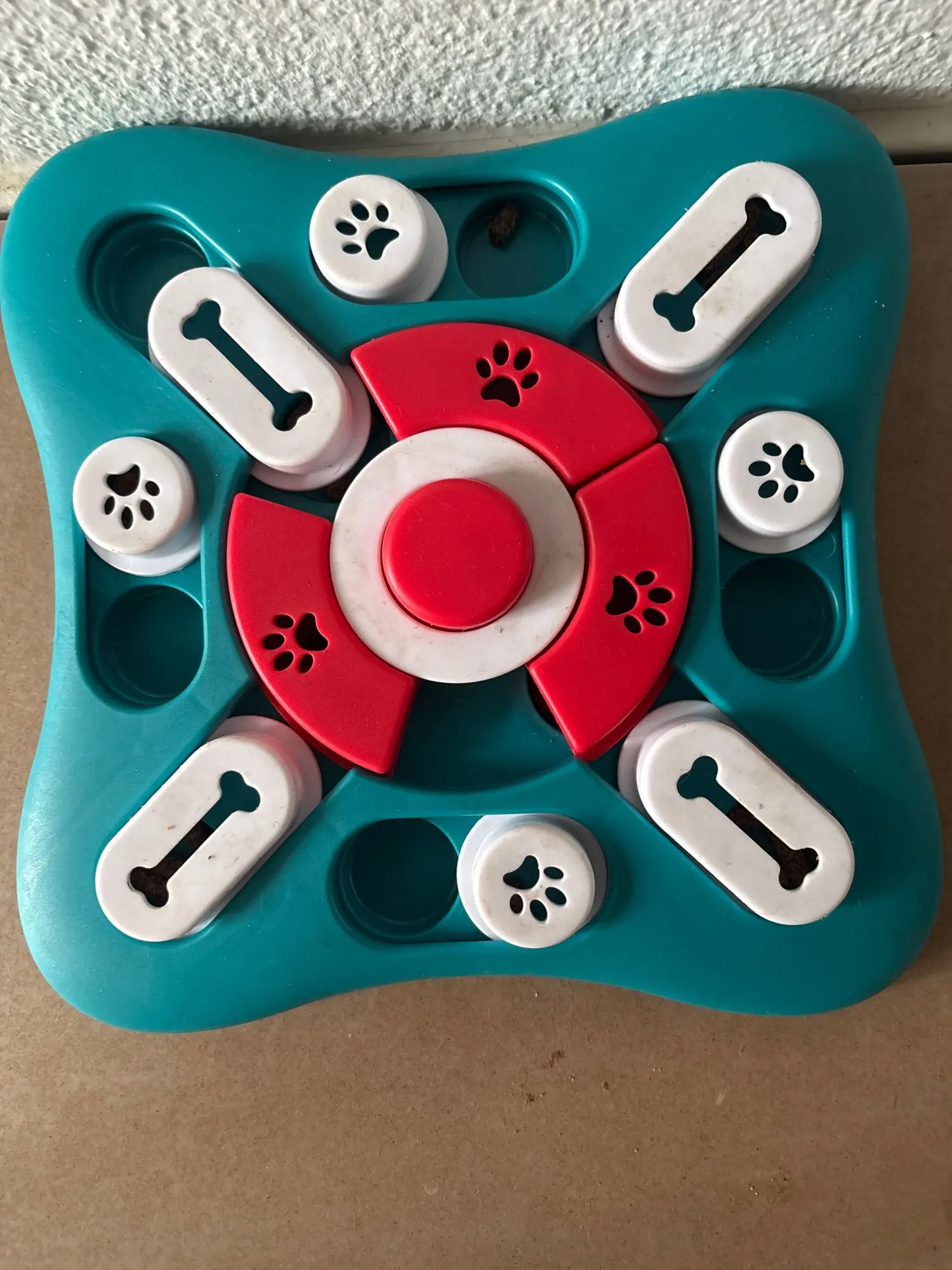 My dog was really enthusiast every time with different flavors. Nice red rope in the middle. It was a challenge for him at the beginning. The small slides are the easiest. He did this snuffel sliding game in 1.5 minutes. What a smart dog I have. You could also learn when it is ready to print on the red round tower in the middle. The material is very strong and there are rubber folds underneath so that it does not move quickly on a smooth ground. This game is nice to play a few times a week when he's tired of it but with a different snack every time. This way he gets a challenge again, which makes it fun. If my dog has grown this way, I will definitely pass it on to another dog in the family or I will give him an asylum. I think another dog will definitely have fun of it. I think this material will take a really long time. Sure if you carefully accompany the dog and show how it should work. Nice !